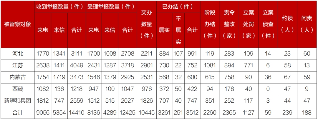 截至4月22日晚22:00,各督察组共收到群众来电、来信举报14410件,受理有效举报12425件,经梳理合并重复举报,累计向有关省(区)和兵团转办10445件。有关省(区)和兵团已办结或阶段办结5772件。其中,立案处罚1127家,立案侦查59件;约谈党政领导干部239人,问责党政领导干部188人。