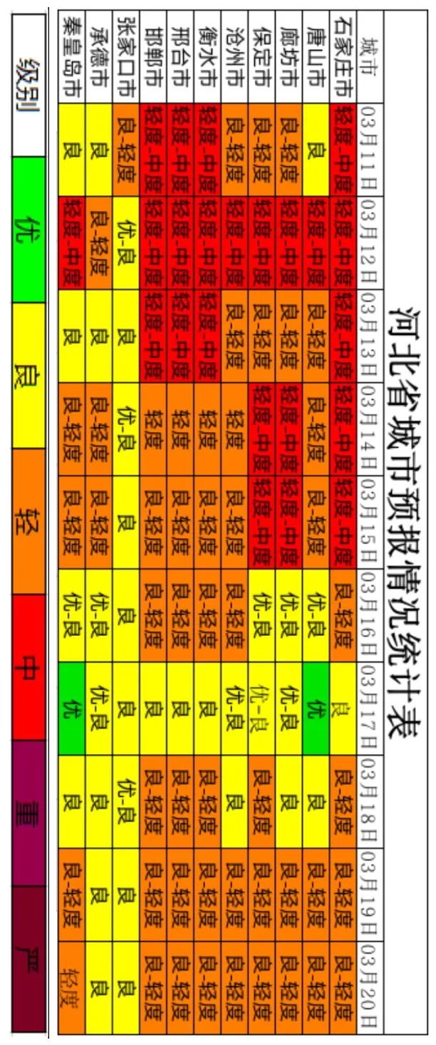 经河北省生态环境应急与重污染天气预警中心与中国环境监测总站和省环境气象中心联合会商,预计2022年3月中旬(11日~20日),11日和13日,受东北高压影响,我省北部和东部地区扩散条件逐步好转,空气质量改善,中南部城市受北风影响偏弱,改善有限,仍以轻度至中度污染为主;期间12日,受低压辐合影响,北部和东部城市污染重新累积,空气质量略有转差;14日,地面气压场转弱,湿度升高,污染略有累积,以轻度污染为主;15日~20日,受高压形势影响,大气扩散条件整体偏有利,空气质量以良至轻度污染为主。具体预报结果如下: