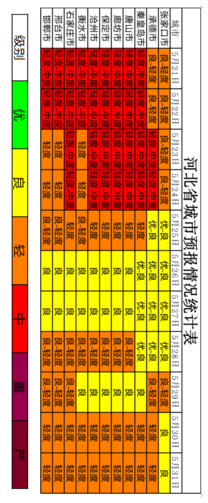 经河北省生态环境应急与重污染天气预警中心与中国环境监测总站、省气象灾害防御和环境气象中心联合会商,预计2022年5月下旬(21日~31日),21日~24日,我省大部城市气温持续30℃以上,近地面以偏南气流为主,气象条件有利于臭氧生成和累积,部分城市可能出现臭氧轻度及以上污染过程。25日起,受可能的降水过程和偏北气流影响,气温略有降低,扩散条件有所好转;28日~31日,我省地面重新转为南风影响,温度快速回升,大部城市空气质量以良至轻度污染为主。
