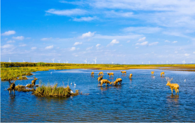 江苏东台条子泥湿地,麋鹿在河塘中嬉戏。(孙家录/人民图片)