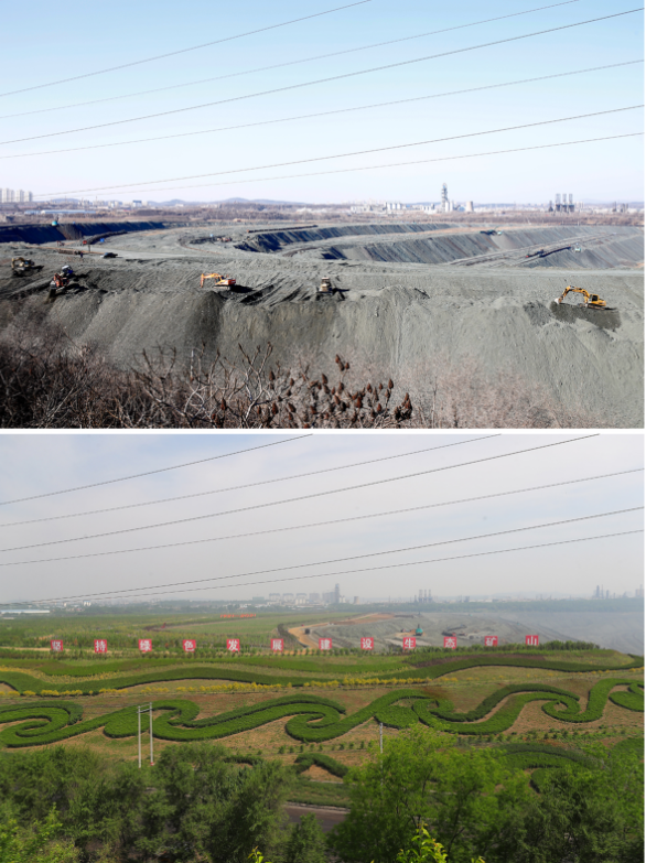 上图为辽宁抚顺西露天矿部分区域生态恢复前的场景(2019年3月6日摄,抚矿集团供图);下图为抚顺西露天矿部分区域生态恢复后的场景(新华社记者杨青2022年6月2日摄,无人机照片)。