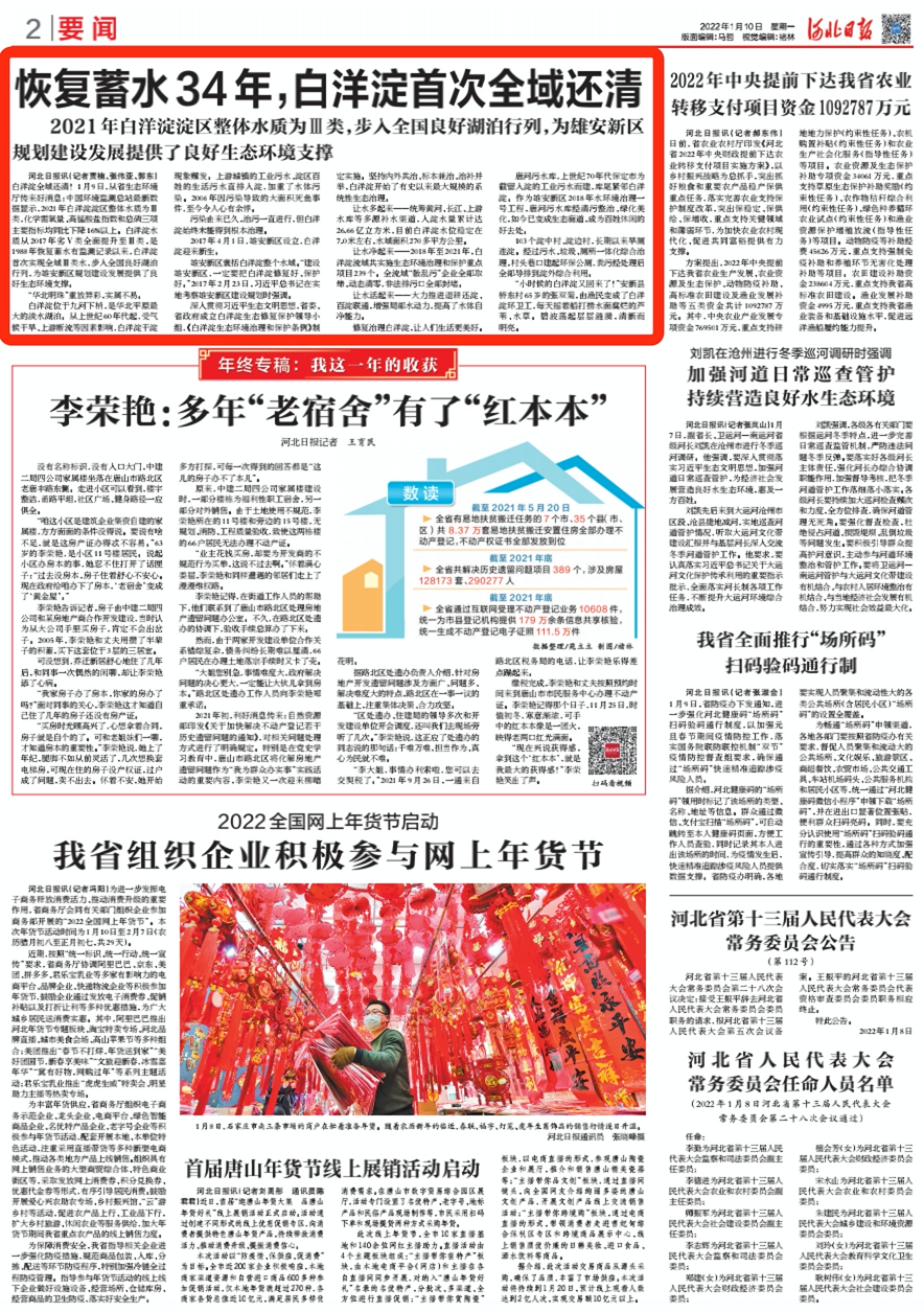让水净起来——2018年至2021年,白洋淀流域共实施生态环境治理和保护重点项目239个。全流域“散乱污”企业全部取缔、动态清零,非法排污口全部封堵。