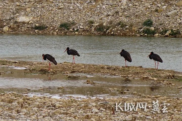 黑鹳在河滩觅食嬉戏。通讯员 王健方 摄