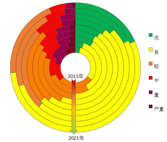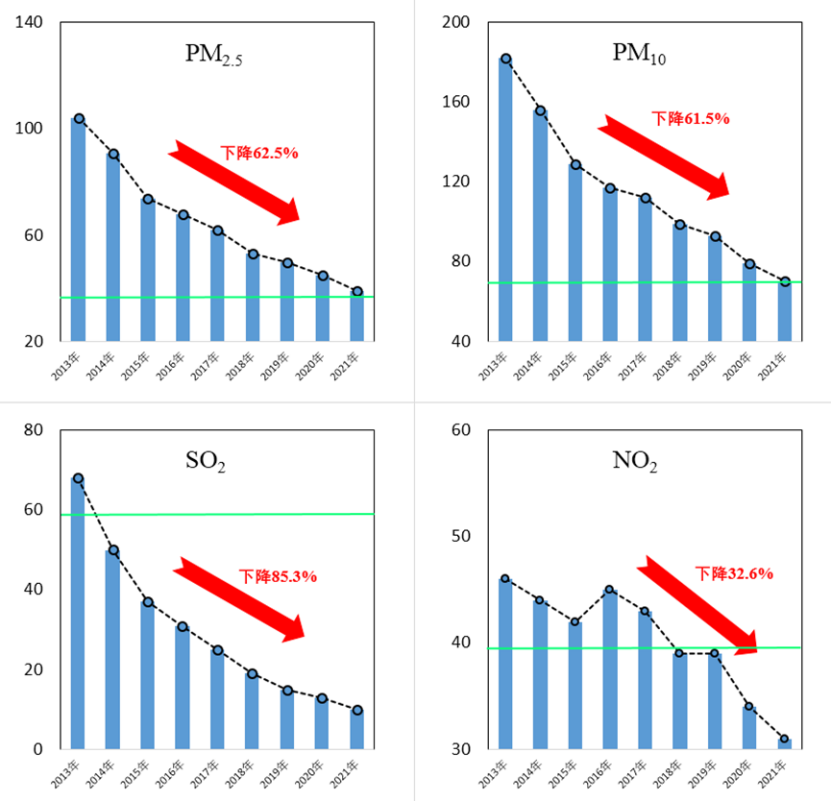 2021年,经过全省共同努力,大气污染物浓度持续下降、达标天数明显增加,重污染天数逐年减少。大气污染物协同控制、大气污染治理取得里程碑式突破,蓝天保卫战取得历史性突破。