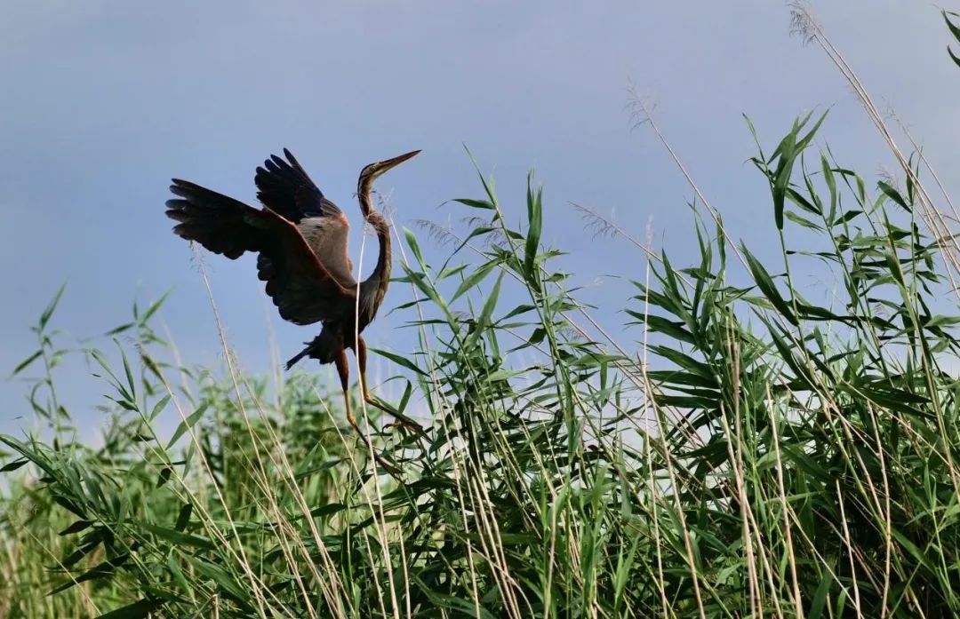 2022年7月10日,图为白洋淀芦苇荡中的鸟类展翅翱翔。河北日报记者李东宇摄