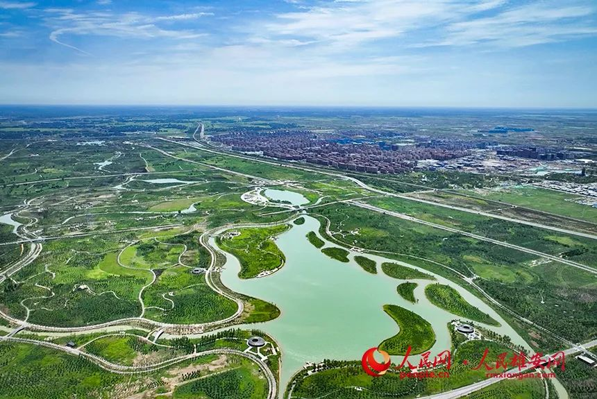 雄安郊野公园与容东片区构成一派园林与城市共生的和谐景象。王世恒摄