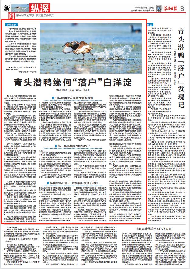 今年7月,省林草局在白洋淀发现世界极危物种、国家一级保护动物青头潜鸭的育雏情况,经专家确认,这是白洋淀首次发现青头潜鸭繁殖,证明白洋淀湿地成为青头潜鸭的繁殖地之一。