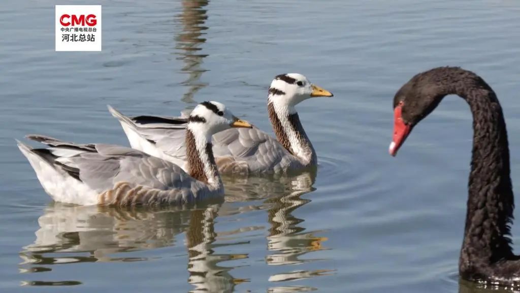 近日,在河北张家口沽源县,两只斑头雁进入了库伦淖尔湖的黑天鹅“居住区”,一待就是一个月。