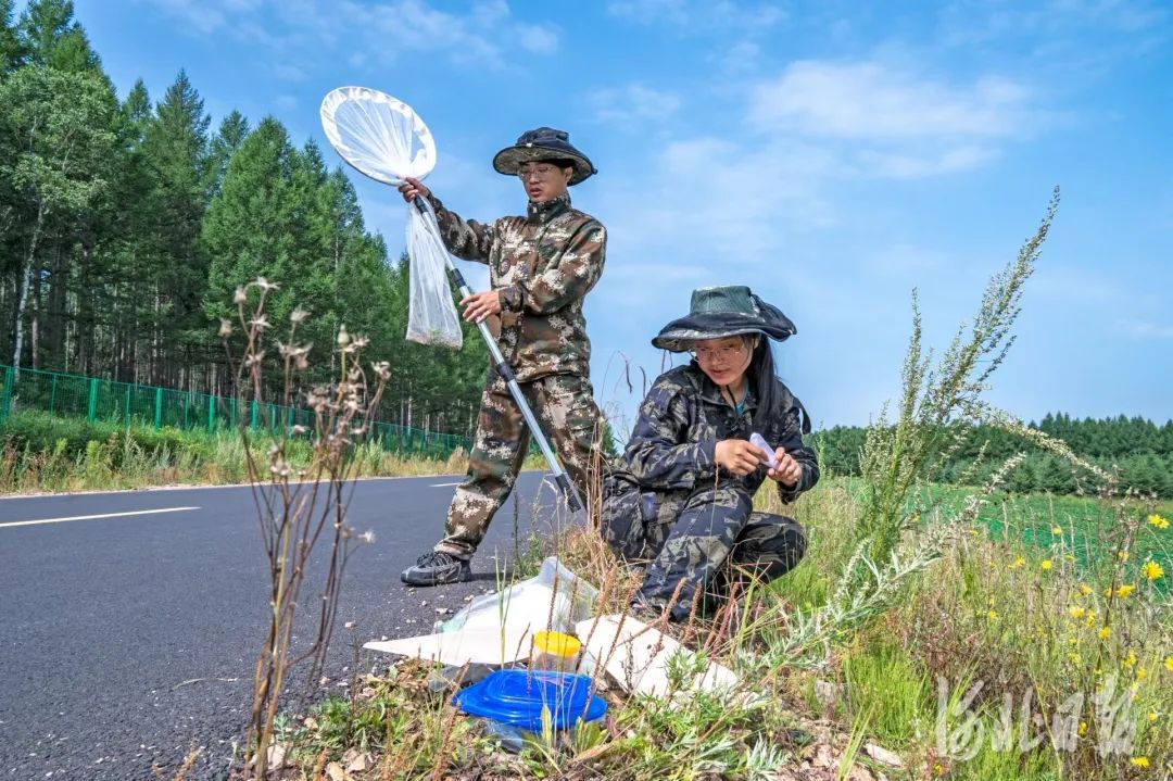 河北农业大学学生在塞罕坝机械林场捕捉昆虫进行课题研究。