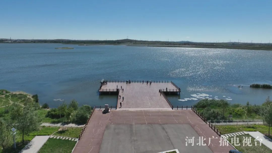 天高云低、碧波荡漾、鱼翔浅底、鸥鹭翱翔。空中俯瞰,蓝色的康巴诺尔国家湿地公园像一颗晶莹剔透的明珠镶嵌在坝上草原。这座占地总面积达5521亩的湿地公园,仅水面面积就有3300亩,占整个湿地公园面积的近60%,相当于整个西湖的三分之一,湖水最深处达3.5米,是河北省距县城最近的一处湿地公园。