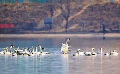 在石家庄市滹沱河叶子广场东侧的水面上,上百只白色的精灵小天鹅在嬉戏。河北日报通讯员 张海强摄