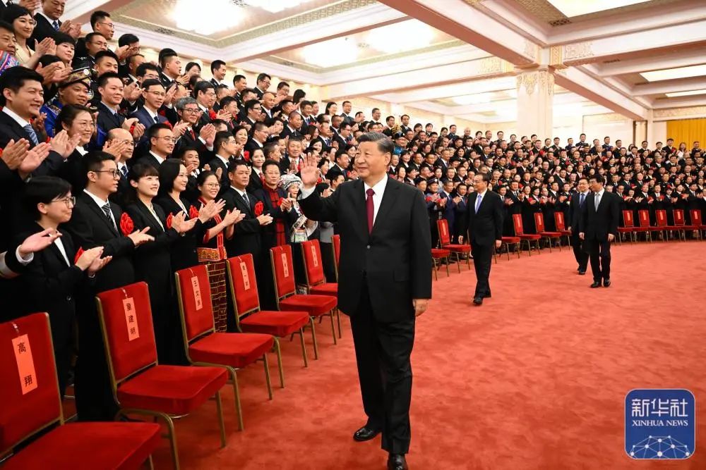 上午11时,习近平等来到人民大会堂北大厅,全场响起热烈掌声。习近平等走到代表们中间,同大家亲切交流并合影留念。