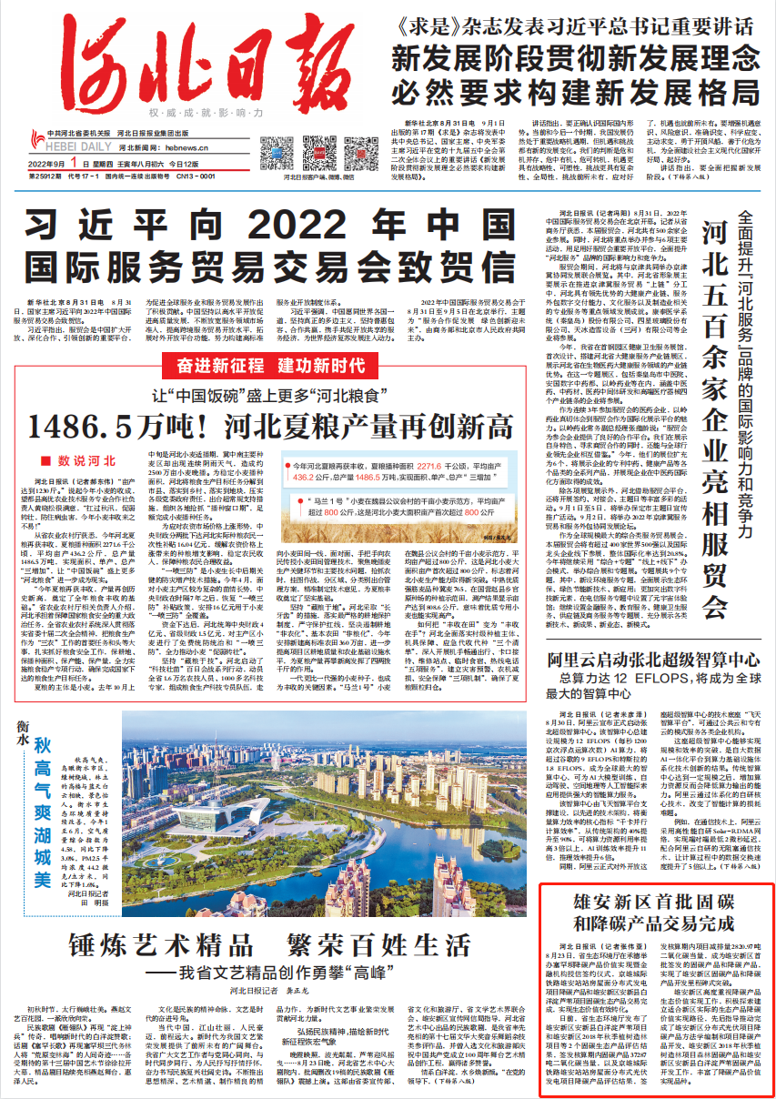 雄安新区首批固碳和降碳产品交易完成(河北日报)