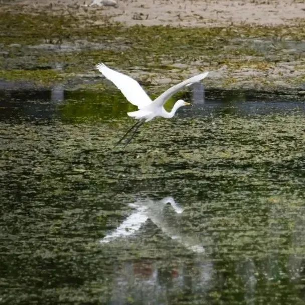 在宜兴河水面,两只黄嘴白鹭纤瘦而修长,身体轻盈,姿态优雅,通体洁白,嘴部呈现橙黄色,头顶至枕部有多枚细长白羽组成的丛状羽冠,在众多水鸟中格外显眼。