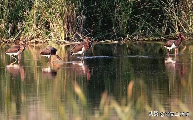 9月12日,摄影爱好者张跃文在张家口明湖发现4只黑鹳觅食,并用相机记录下这一场景,这是他继9月初在明湖拍到3只黑鹳后再次拍到的黑鹳影像。据悉,连日来,明湖陆续飞来多只黑鹳,吸引众多摄影爱好者前来观鸟、拍鸟。