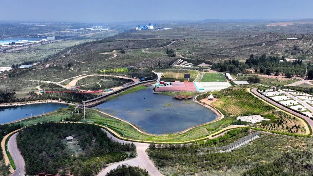 陕西神木市大柳塔镇煤海塞罕坝中心公园(2022年8月3日摄,无人机照片)。这里曾属煤矿采煤沉陷区,现以水保生态建设为主体,结合绿化美化,已初步形成集休闲、娱乐、科教为一体的采煤沉陷区治理典范,公园内植被茂盛、色彩斑斓、基础设施功能齐全。新华社记者 陶明 摄