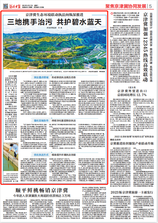 北京市怀柔区与丰宁共同开展了汤河、天河沿岸联合执法专项行动;北京市房山区与保定市涞水县、涿州市针对三地交界地区环境监察执法工作进行线上会商;天津市滨海新区、沧州渤海新区黄骅市开展跨区域水环境联合检查……