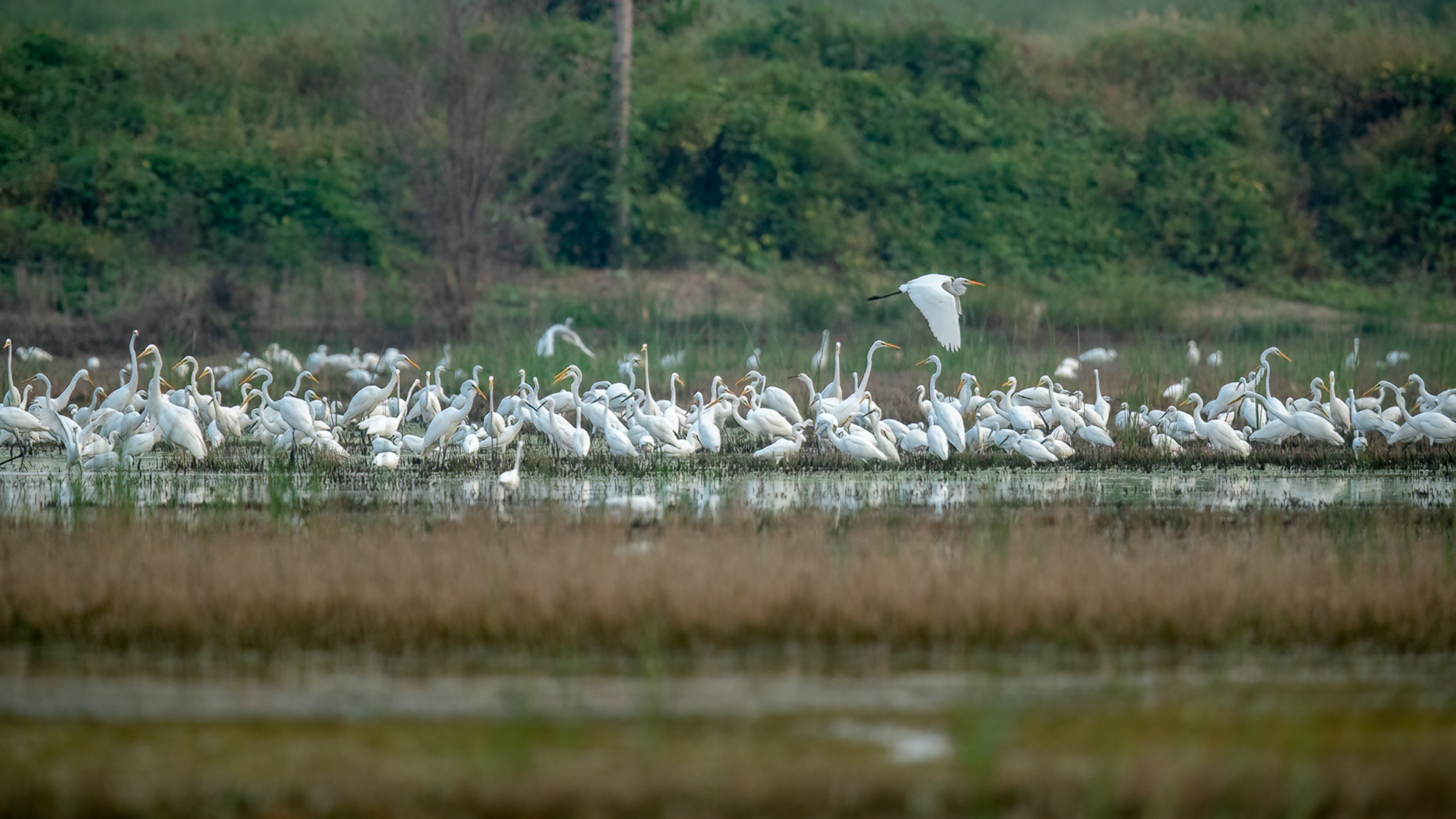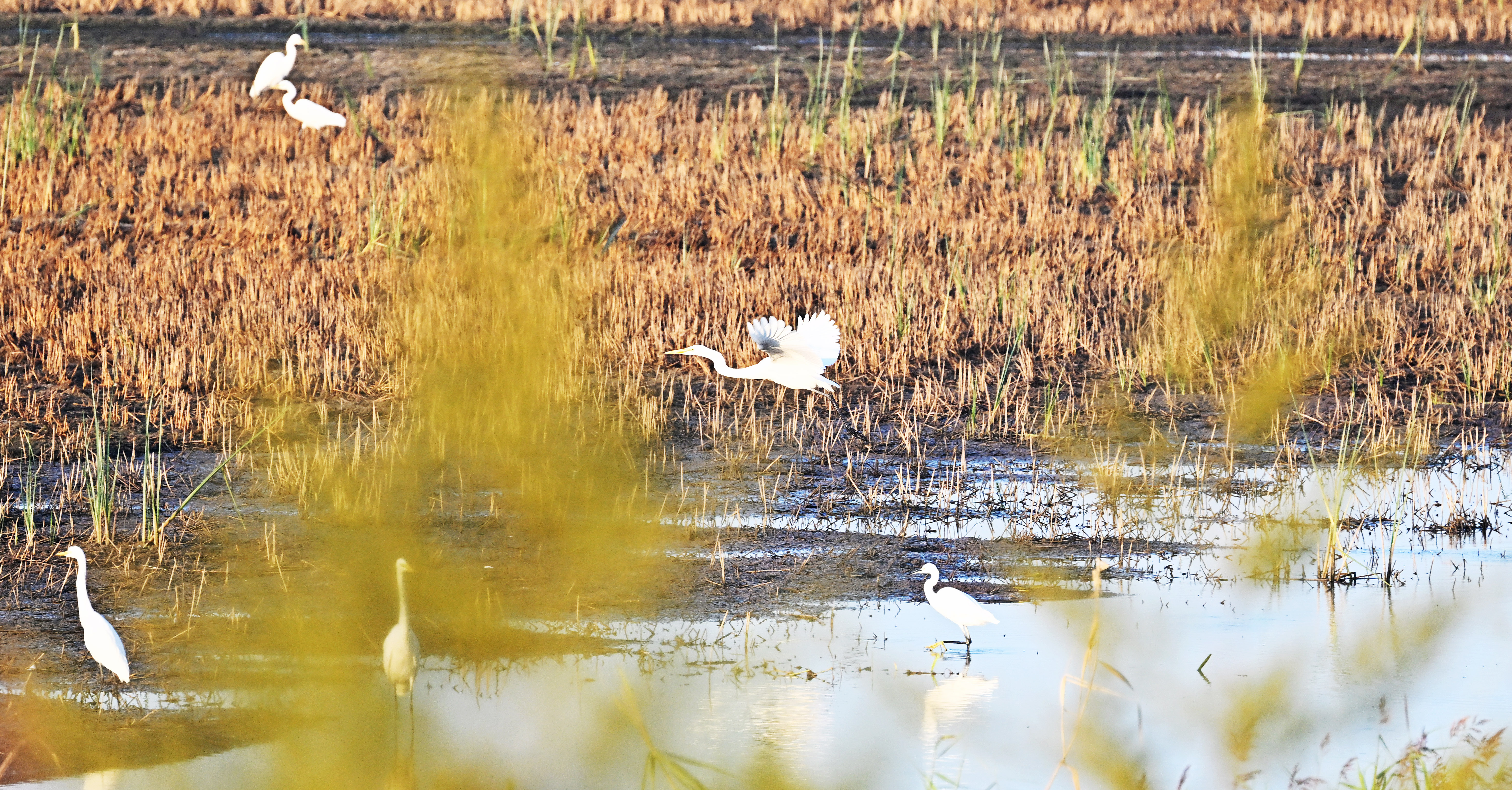 成群白鹭在安新县唐河流域栖息觅食。湿地、田野上随处可见白鹭翩翩起舞,成为一道靓丽的风景线。河北日报记者 张昊摄