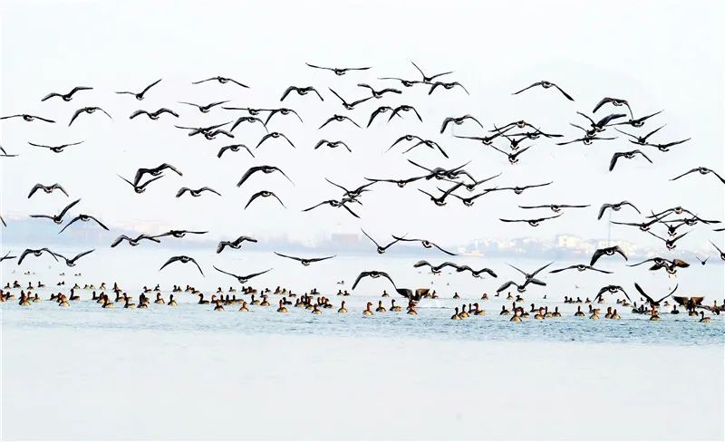 成群的大雁栖息在磁县溢泉湖畔越冬。河北日报记者杜柏桦 摄
