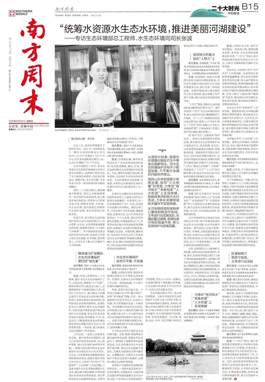 为深入学习贯彻党的二十大精神,交流心得体会,将学习成效转化为建设美丽中国的生动实践,生态环境部政务新媒体特设“学习党的二十大精神·司局长访谈”栏目,转发《南方周末》系列采访报道。今天我们一起来看生态环境部总工程师、水生态环境司司长张波的访谈。