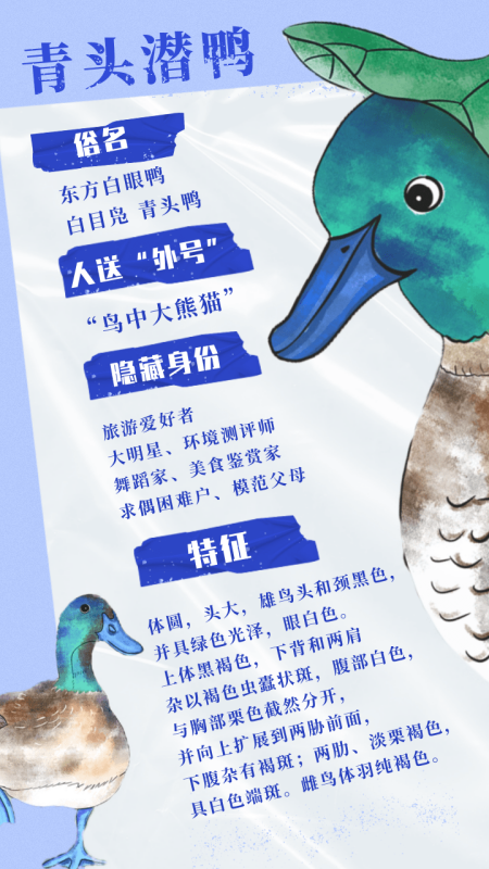 看了青头潜鸭的身份牌,你是不是更了解它们了鸟类是地方生态系统的“环评师”,为了保护它们,近年来,河北省不断加大野生动植物保护力度,完善各项保护制度,划定禁猎区,规定禁猎期,编制实施了系列生态保护、修复和建设规划,稳步推进野生动物栖息地保护项目,恢复了一批重要的野生动物栖息地。