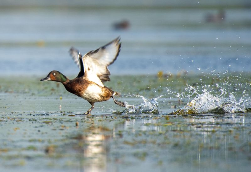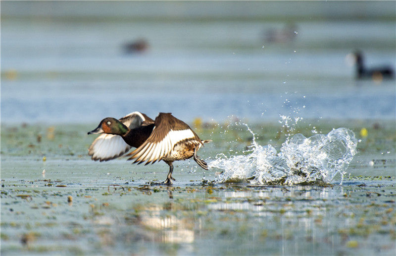青头潜鸭在白洋淀水域飞翔。河北日报记者李东宇摄
