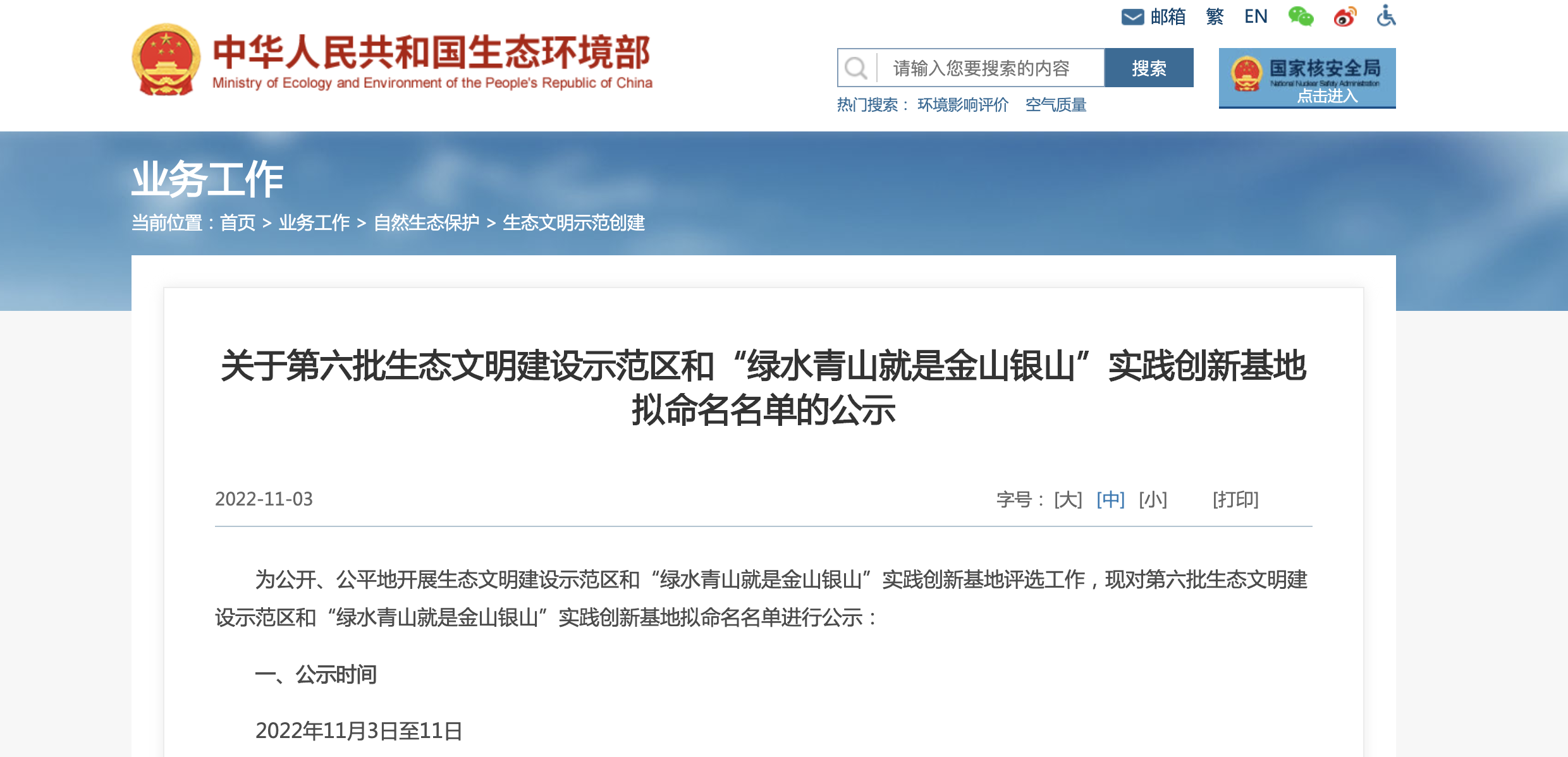 为公开、公平地开展生态文明建设示范区和“绿水青山就是金山银山”实践创新基地评选工作,现对第六批生态文明建设示范区和“绿水青山就是金山银山”实践创新基地拟命名名单进行公示: