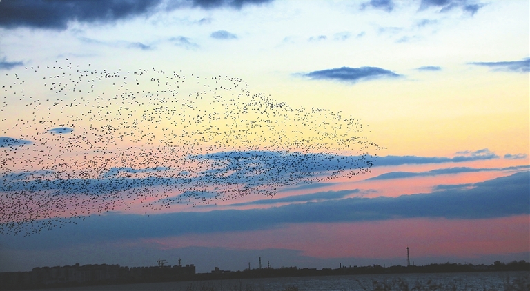 成群的越冬候鸟在河北衡水湖畔“集结”,上演“鸟浪”奇观。衡水滨湖新区管委会供图