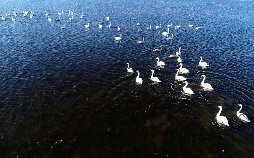 近日,一群天鹅在张家口市怀来县官厅水库国家湿地公园栖息。