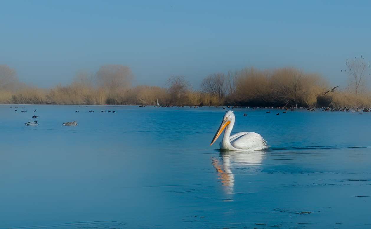 而此前的12月6日下午,衡水湖巡护员李国忠进行日常巡查时,发现一只羽色灰白的大鸟停在水面上,长喙下部带有橘黄色的皮囊,头顶部羽毛卷曲。11日上午,当地摄影爱好者张学锋又发现了这只大鸟,他拍下画面后,经过鸟类专家和保护区资源保护局两度鉴定,确认是国家一级保护鸟类卷羽鹈鹕。在我国,卷羽鹈鹕主要在长江中下游越冬。查阅记录,这是它时隔十年再度现身衡水湖。