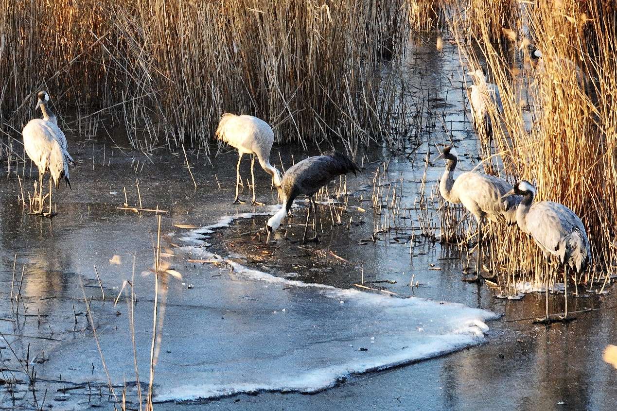 白头鹤(中)啄破薄冰觅食。李明/摄。
