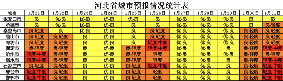 经河北省生态环境应急与重污染天气预警中心与中国环境监测总站、省气象灾害防御和环境气象中心联合会商,预计2023年1月下旬(21~31日),期间21~22日、25~26日、30~31日,我省处于冷空气间歇期,地面转南风影响,风力偏弱,湿度升高,污染累积,部分城市以轻度至中度污染为主。