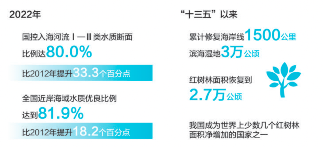 生态修复成效显著。“十三五”以来,我国开展渤海综合治理攻坚战、海岸带保护修复工程等,累计修复海岸线1500公里,滨海湿地3万公顷,红树林面积恢复到2.7万公顷,成为世界上少数几个红树林面积净增加的国家之一。海洋生态环境总体改善,为珍稀濒危物种提供了良好栖息环境,布氏鲸、中华白海豚、斑海豹等海洋珍稀濒危物种种群规模稳步扩大。