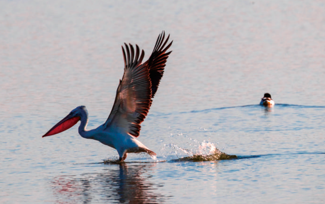 江苏东台条子泥湿地,卷羽鹈鹕展翅飞翔。孙家录摄(人民视觉)