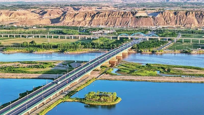 新时代生态文明建设的成就举世瞩目,成为新时代党和国家事业取得历史性成就、发生历史性变革的显著标志。图为2023年6月13日,位于宁夏中卫的黄河公路大桥、黄河铁路大桥与黄河湿地交相辉映,美丽如画。人民图片 柴更利/摄