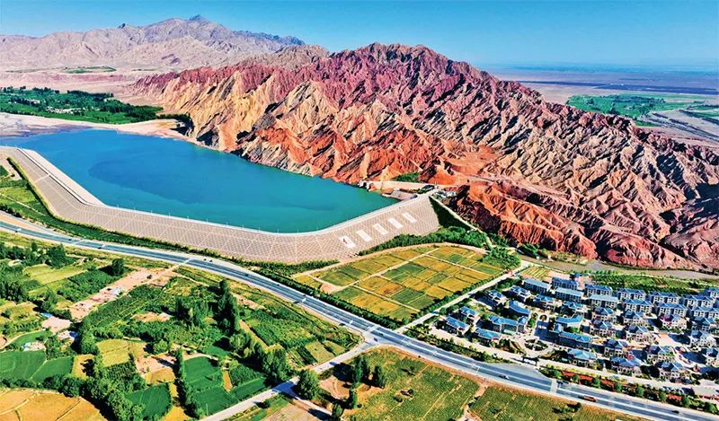 党的十八大以来,经过顽强努力,我国天更蓝、地更绿、水更清,万里河山更加多姿多彩。图为2023年6月15日,甘肃省张掖市临泽县的红山湾水库与丹霞美景构成一幅“戈壁水乡”生态和谐绚丽多彩的画卷。人民图片 王将/摄