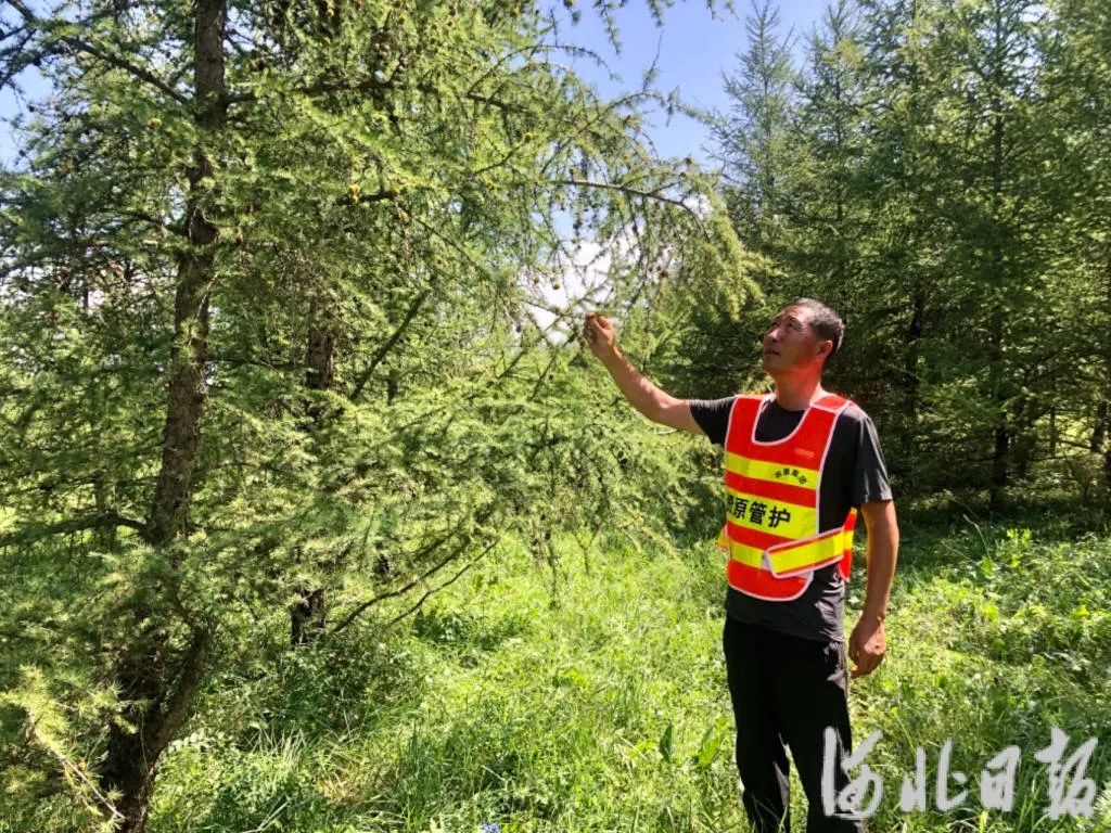 8月21日,承德御道口农垦实业集团如意河经营管理站护林护草员秦国柱在查看树木生长情况。河北日报记者 马朝丽摄